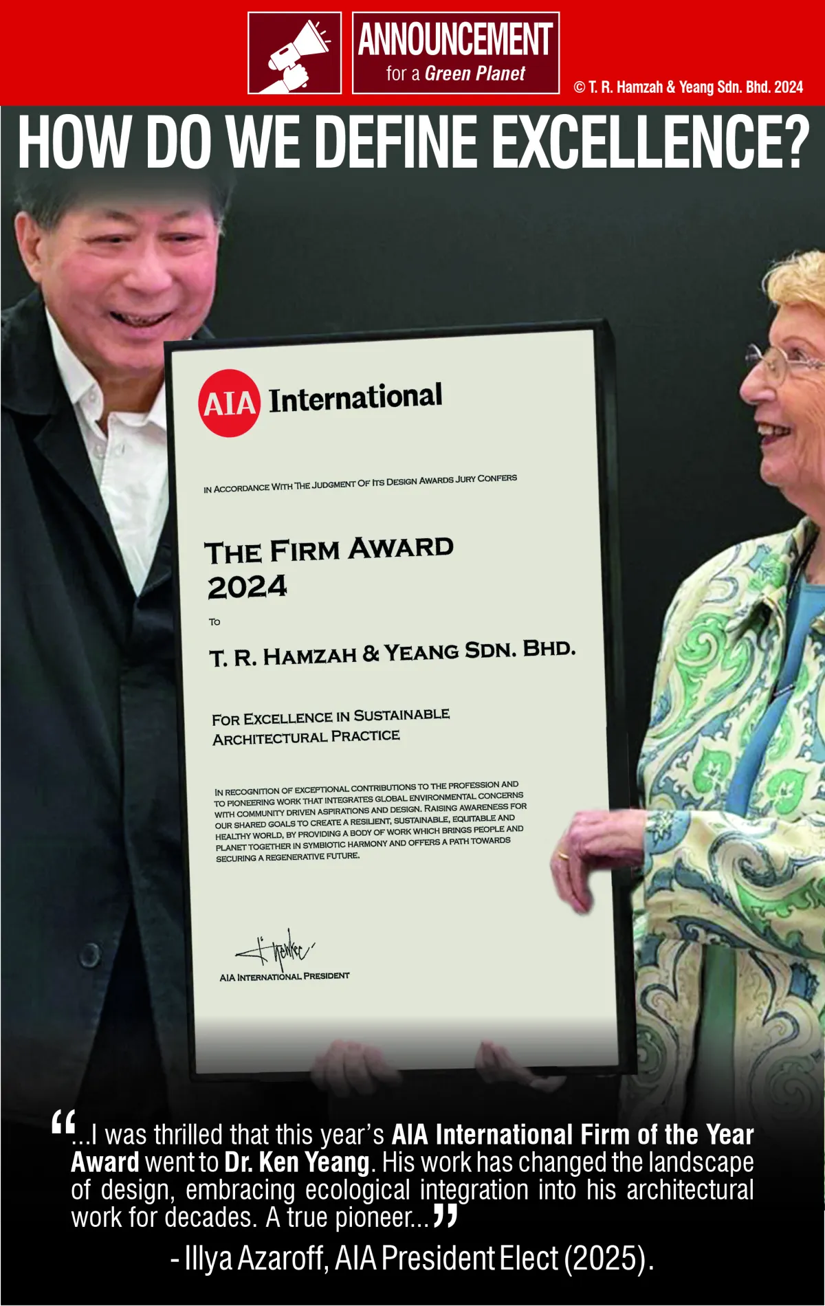 Illya Azaroff, AIA National President-Elect (2025-26), mentioned Dr. Yeang, stating: