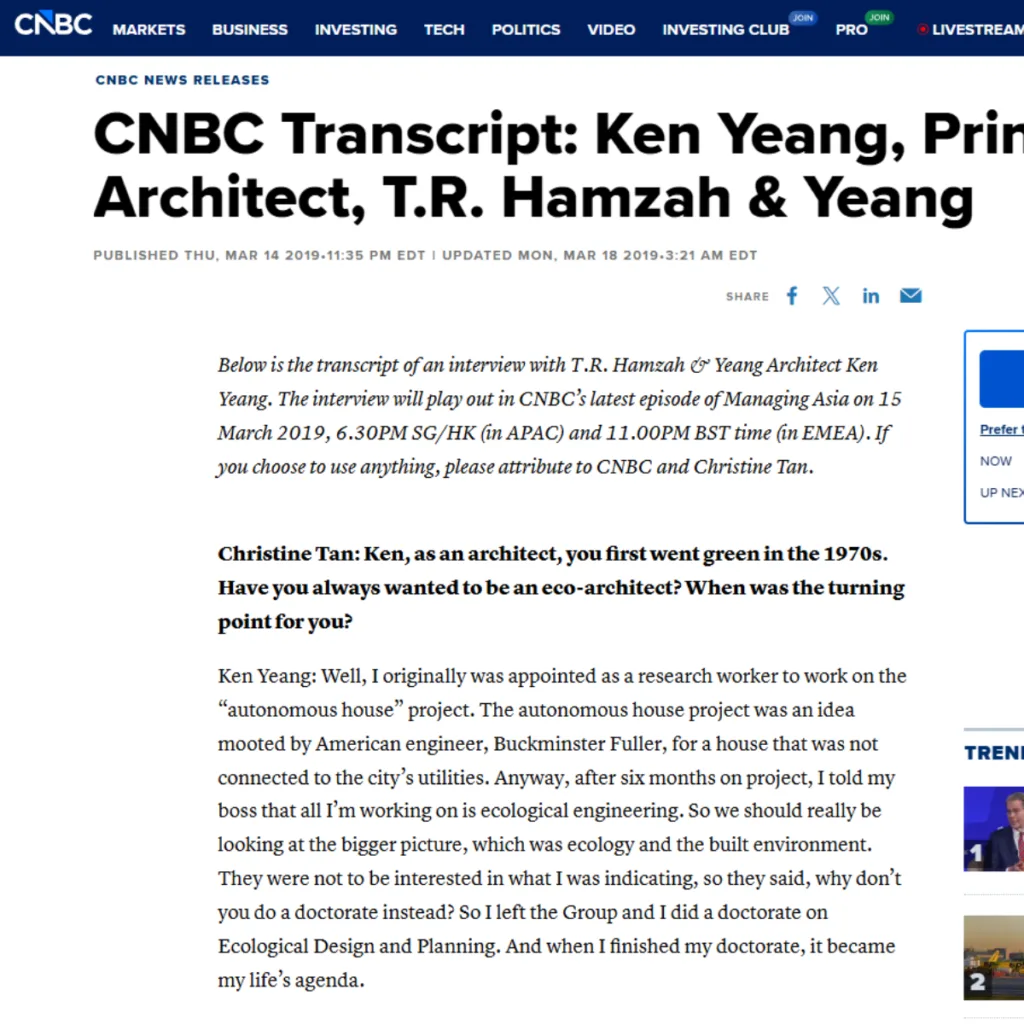 CNBC Transcript: Ken Yeang, Principal Architect, T.R. Hamzah & Yeang