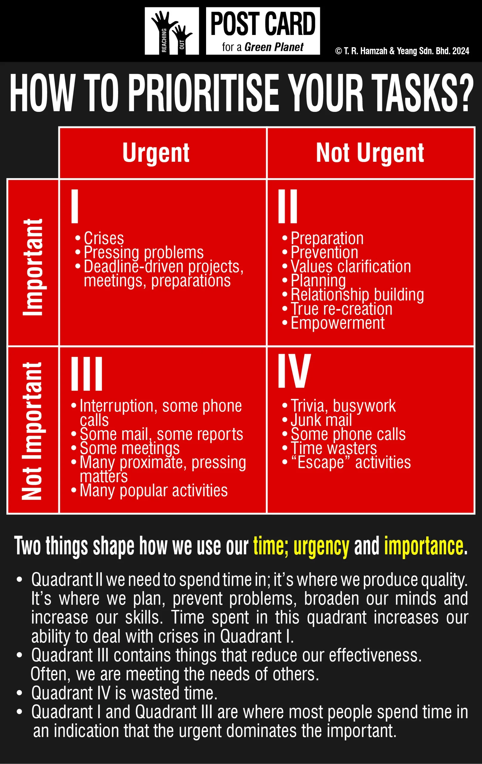 This matrix categorizes tasks into four quadrants based on urgency and importance: