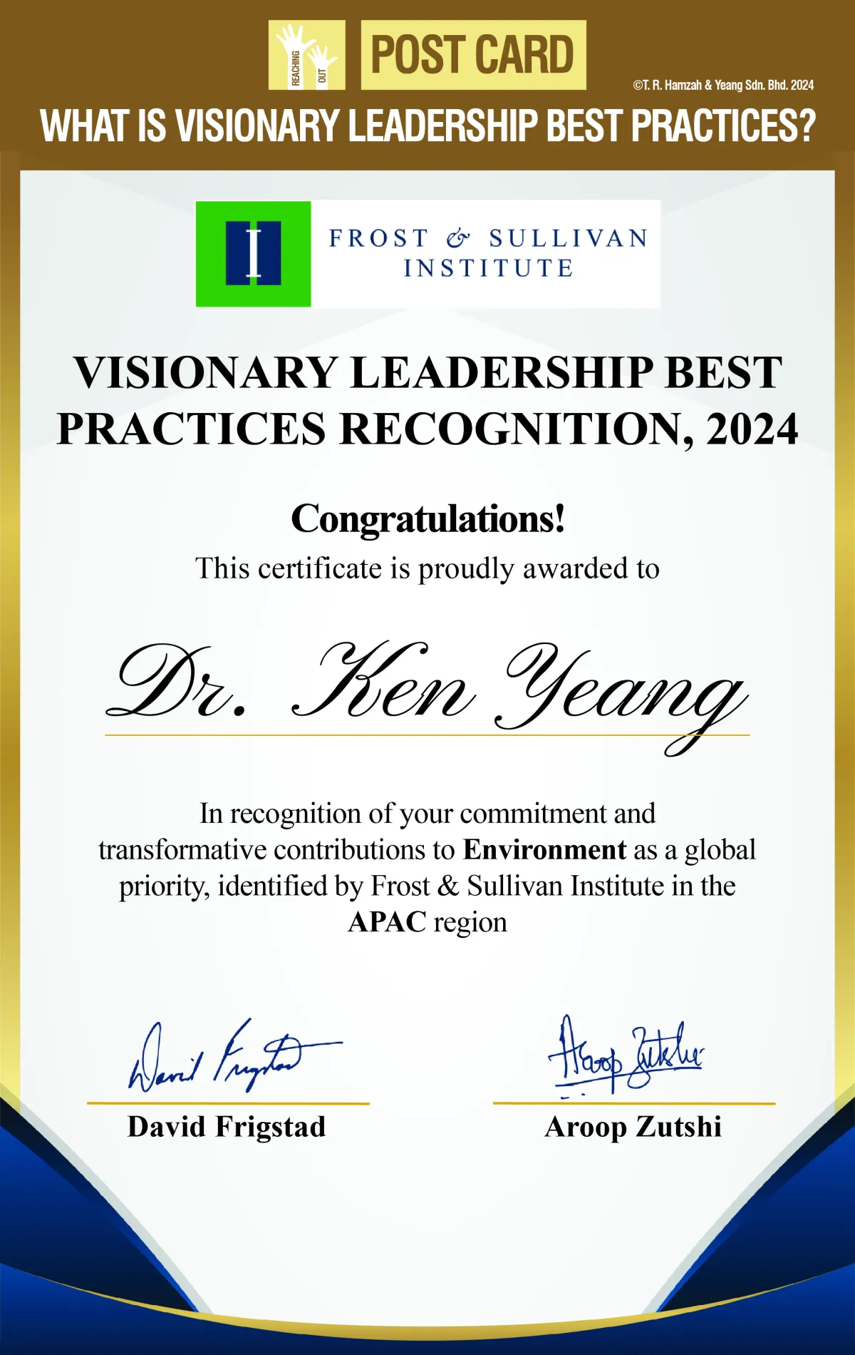 The Visionary Leadership Best Practices Recognition 2024, presented by the Frost & Sullivan Institute, honors Dr. Ken Yeang for his transformative contributions to the environment as a global priority.